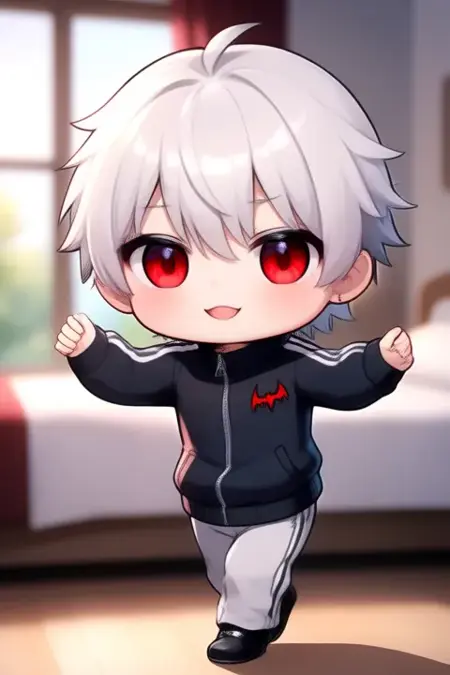 示例提示:Kuzuha,动漫风格男孩。图像展现了一位动漫风格的角色,拥有白色头发,造型凌乱而尖耸。角色拥有醒目的红色眼睛,在苍白的皮肤上十分突出。身穿深色高领毛衣,搭配一件黑色夹克,夹克带有拉链,袖子上有白色条纹,左胸处有一个小型红色蝙蝠标志,下身穿着略带光泽的灰色运动裤,(她正在跳舞:2.5),(Q版Nendoroid:3.5) 在卧室中。
