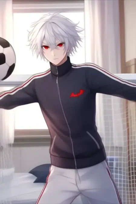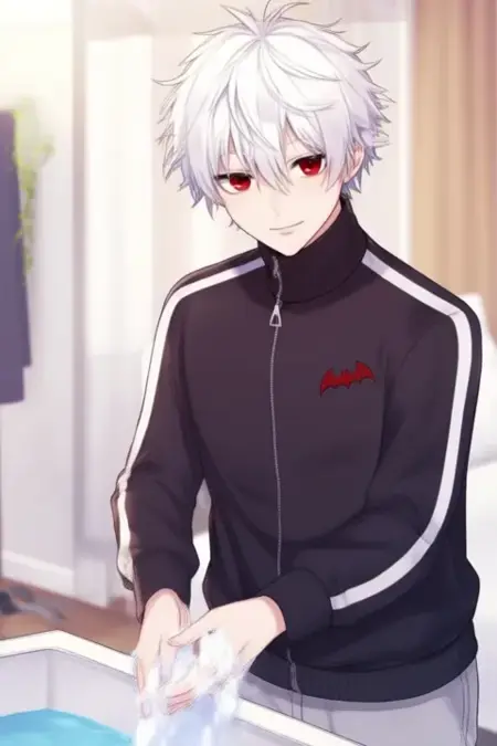 触发词:Kuzuha,动漫风格男孩。图像展现了一位动漫风格的角色,拥有白色头发,造型凌乱而尖耸。角色拥有醒目的红色眼睛,在苍白的皮肤上十分突出。身穿深色高领毛衣,搭配一件黑色夹克,夹克带有拉链,袖子上有白色条纹,左胸处有一个小型红色蝙蝠标志,下身穿着略带光泽的灰色运动裤。