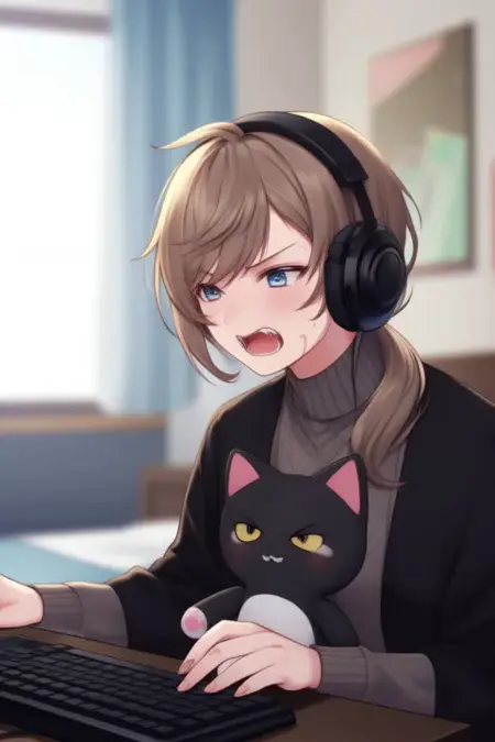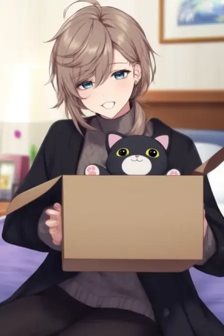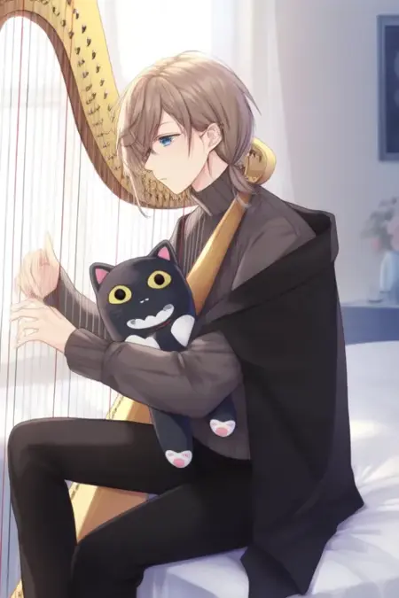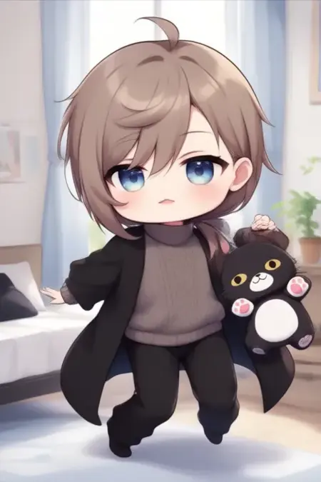 sample prompt:Kanae, anime-style boy. The image features a person with light brown hair styled in a side ponytail. The individual has blue eyes and is wearing a dark-colored outfit consisting of a high-neck sweater over a black coat. The character is also holding a plush toy resembling a black cat with yellow eyes and pink paws, (she is dancing:2.5), (chibi Nendoroid:3.5) in bedroom.