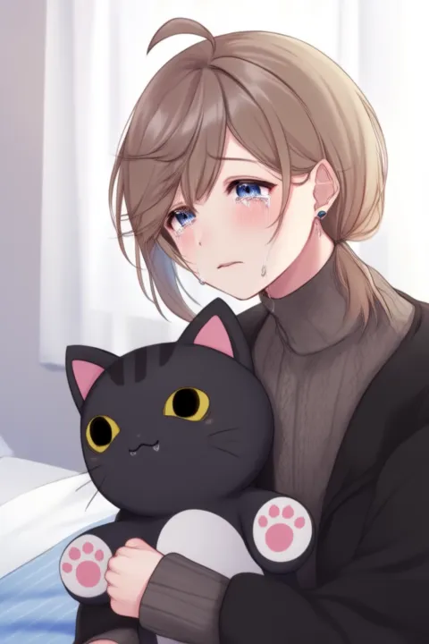 Trigger Word:Kanae, anime-style boy. The image features a person with light brown hair styled in a side ponytail. The individual has blue eyes and is wearing a dark-colored outfit consisting of a high-neck sweater over a black coat. The character is also holding a plush toy resembling a black cat with yellow eyes and pink paws