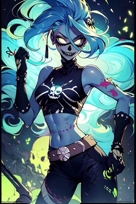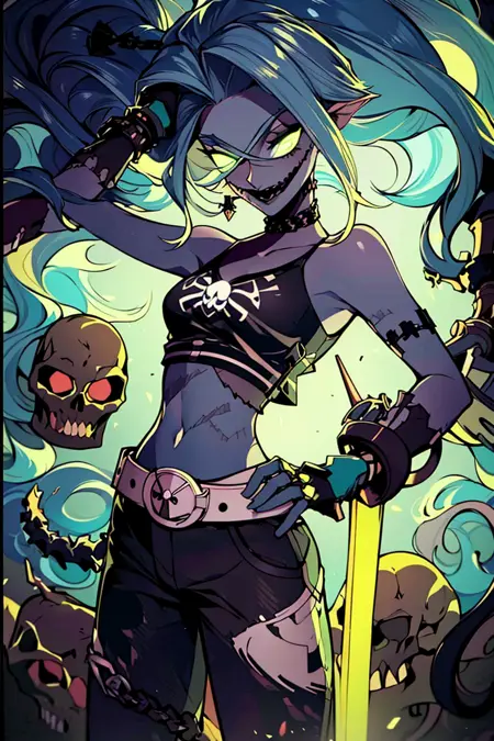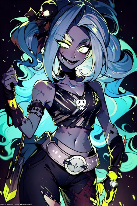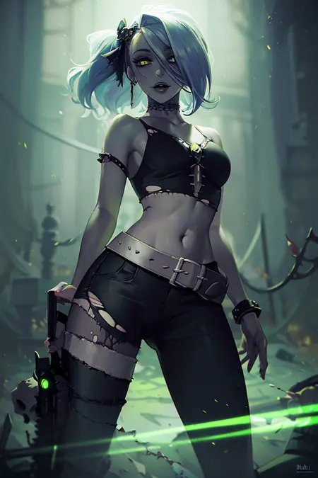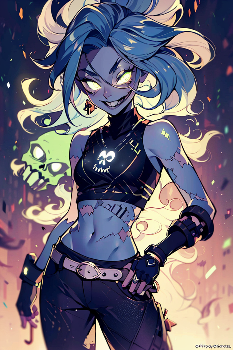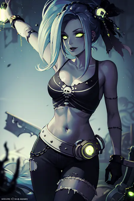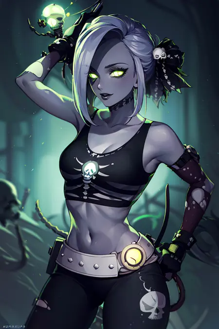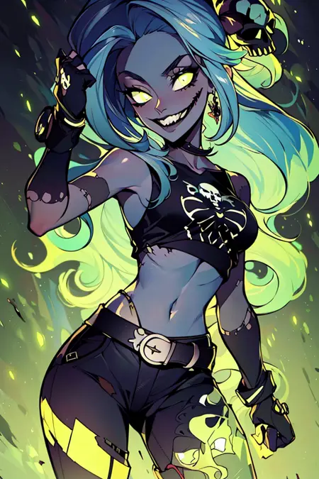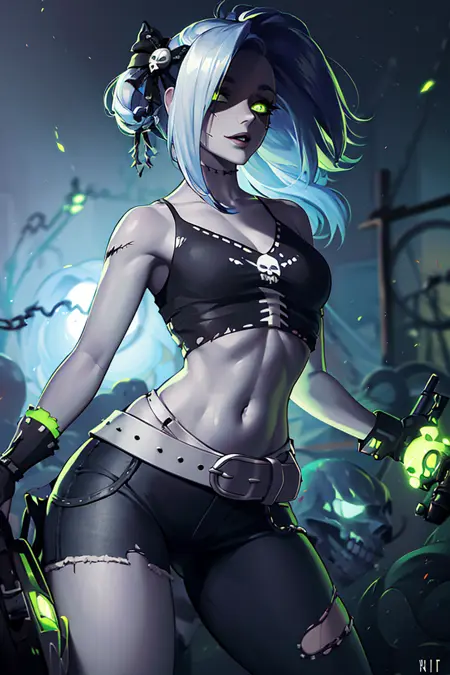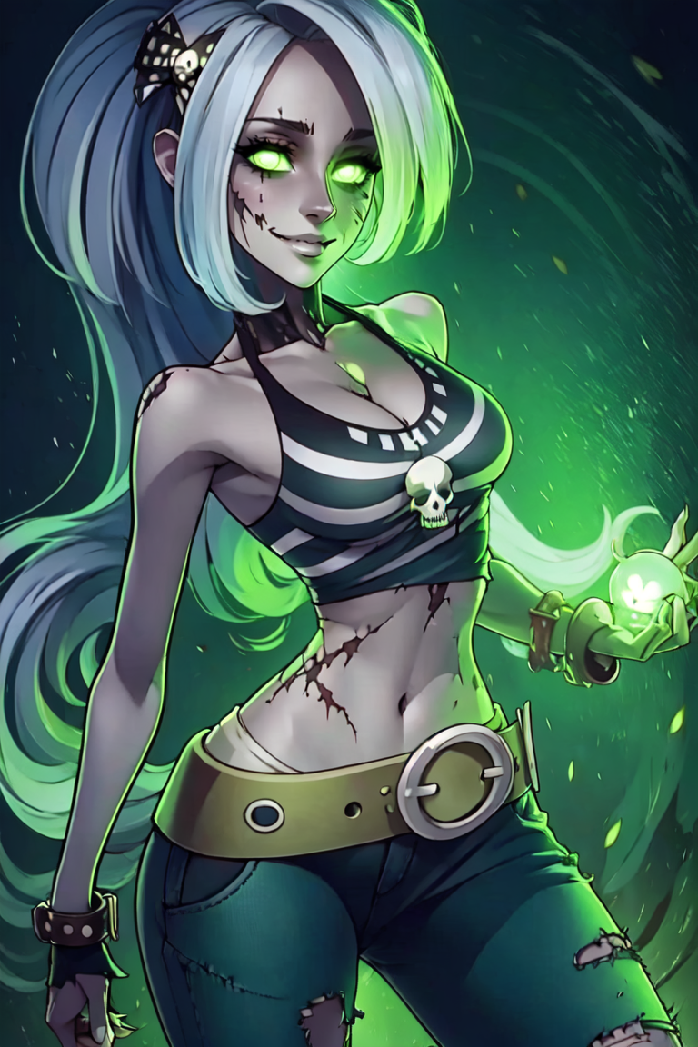 추가 프롬프트: zombie, grey skin, torn clothes, skull, glowing, midriff, belt, pants,