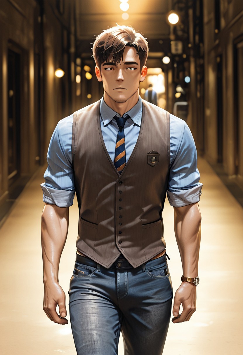 Shirt×Vest×Denim,collared shirt,vest,jeans,necktie,wristwatch,