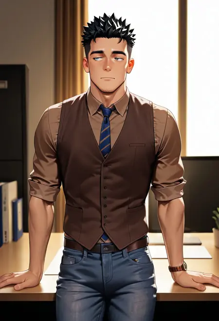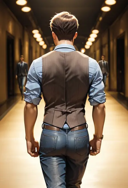 此LoRA专为休闲穿搭设计:衬衫+马甲+牛仔裤。