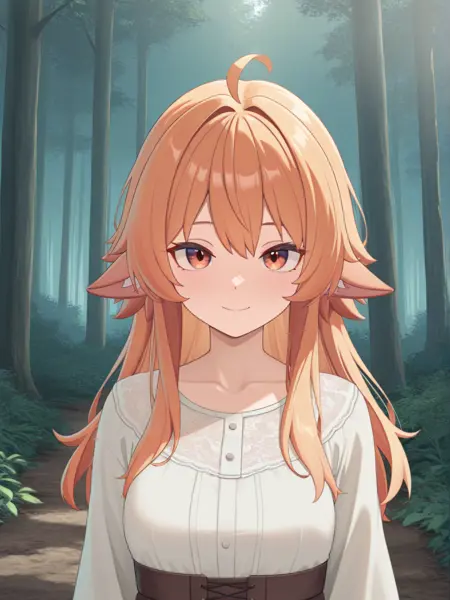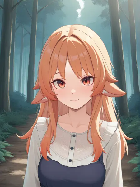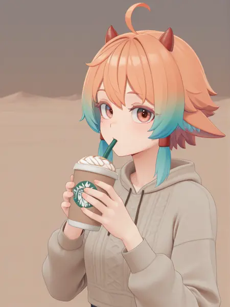 "주황색 머리카락, 청록색 끝, 청록색 패턴이 있는 주황색 긴 소매 셔츠, 청록색 치마, 청록색 소매, 파란색 양말, 흰색 뿔, 주황색 눈"