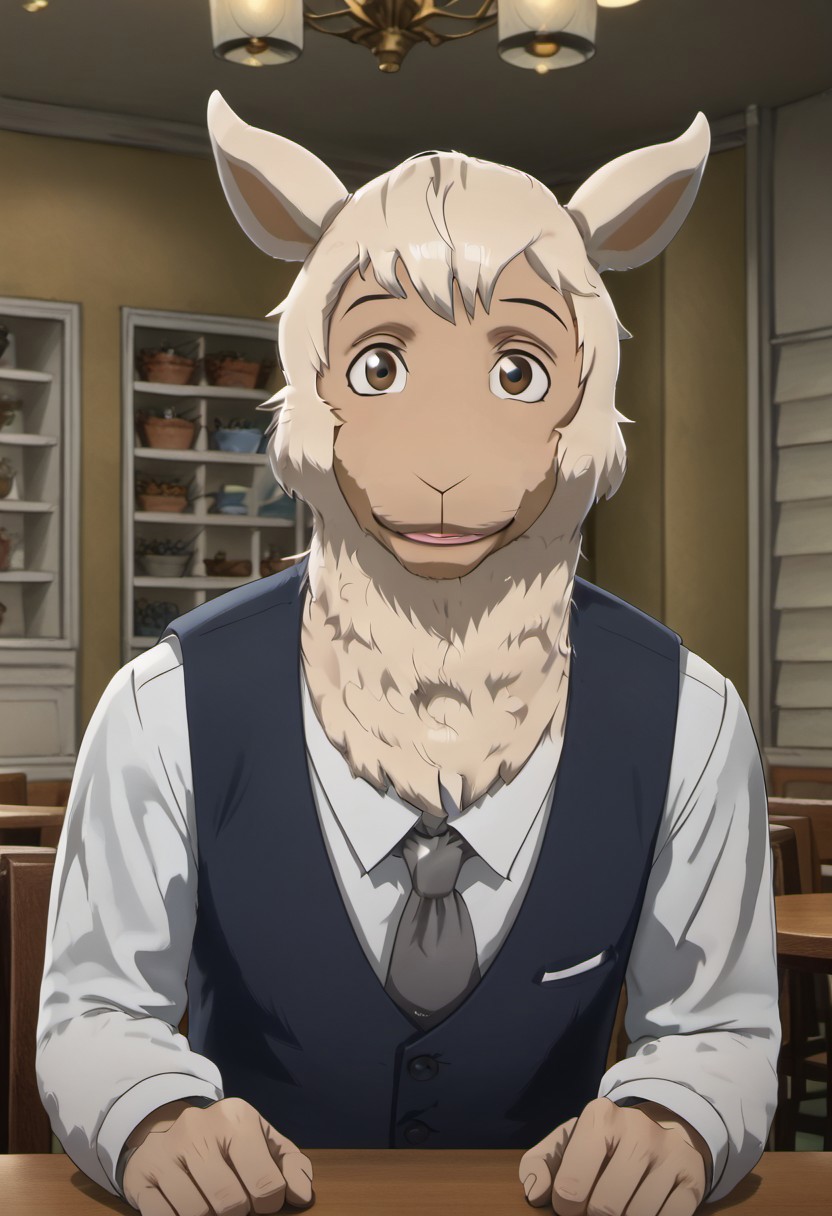 Tem, 1boy, mature male, male, anthro, alpaca, animal ears, brown eyes, light skin, white wool