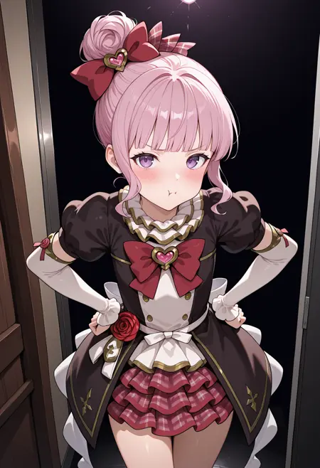 gbflinr,单发髻,粉发,鬓发,紫眼,平胸,齐刘海,