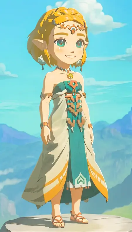 提示词建议:totkzelda, 1girl, solo, zonai dress, short hair, bare shoulders