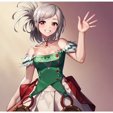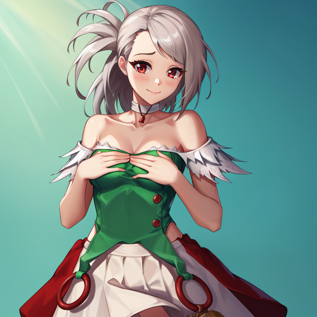 DNF_Seria_Kirmin, 1girl, solo, red eyes, grey hair, boots, skirt, bare arms, bare shoulders, choker, white skirt, knee boots, collarbone, green shirt ,brown footwear