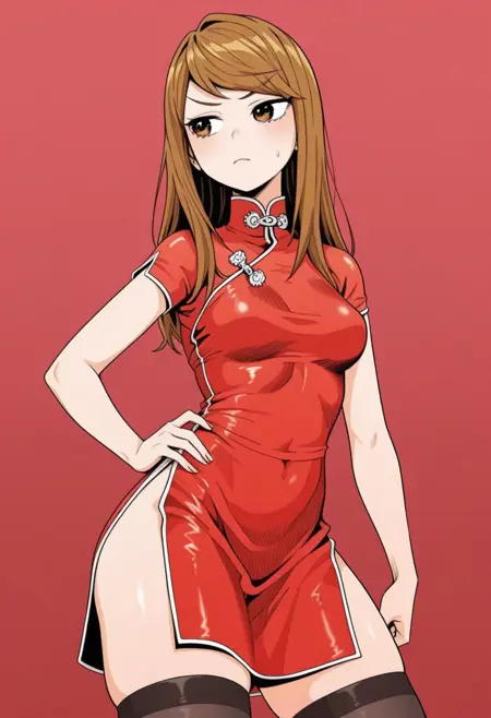 muming, 1girl, solo, dress, red china dress, sleeveless china dress, bandaged hand