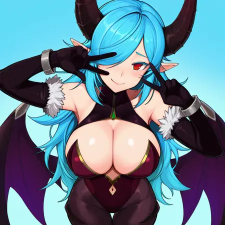 DNF_Succubus_Princess, 1girl, solo, red eyes, long hair, blue hair, hair over one eye, large breasts, demon girl, wings, horns, demon wings, demon horns, pointy ears, cleavage, navel, thigh gap, leotard, fur trim, navel cutout, clothing cutout, bare shoulders, gloves, black gloves, elbow gloves, pantyhose, bracelet, jewelry
