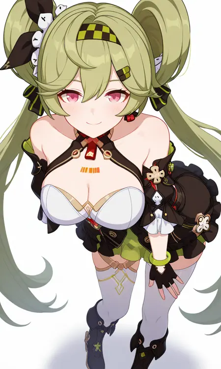 - ai hyperion lambda \(honkai impact\),earrings, dress,jewelry, large_breasts, green_hair, long_hair, looking_at_viewer, smile,twintails, very_long_hair, boots,fingerless_gloves, thighhighs,skirt,white_legwear,hair_between_eyes,