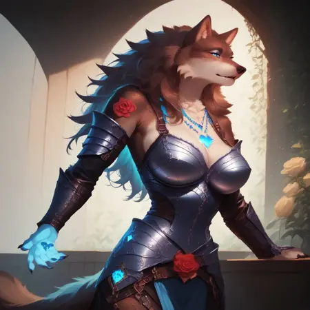 1girl, Starlight Celest, wolf girl, large breasts, anthro furry female, tattoo, red tattoo, roses tattoo, blue eyes, animal ears, blue glowing necklace, brown fur, two-toned fur, light brown body, fluffy fur, detailed body fur, plantigrade hands