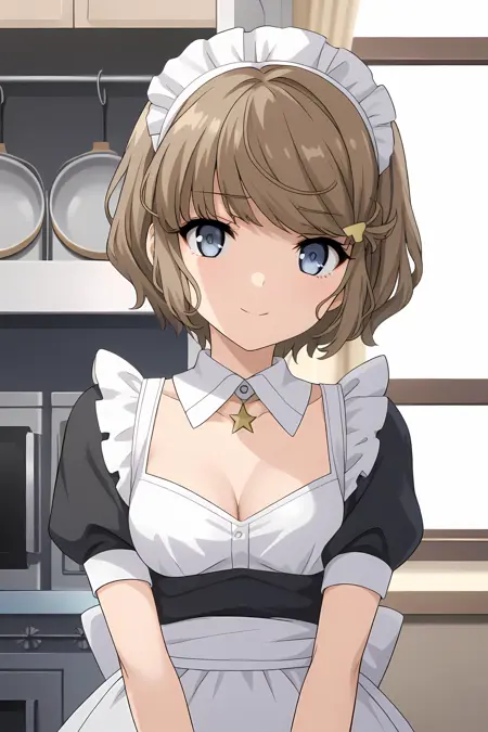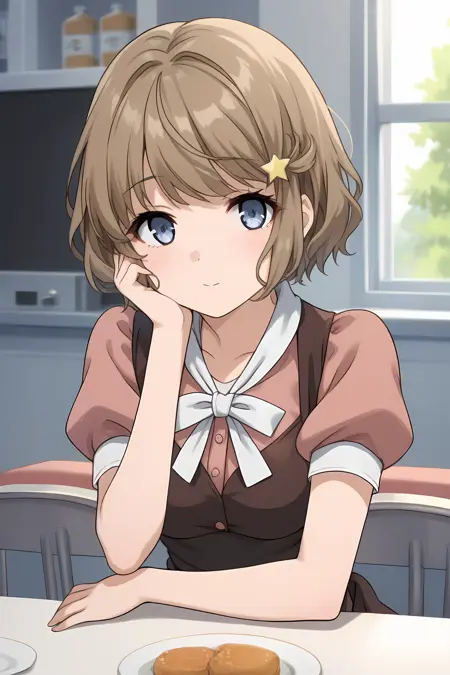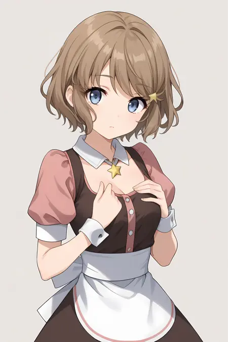 갈색 머리, 단발, 파란 눈, 앞머리, 헤어클립, 별 모양 목걸이