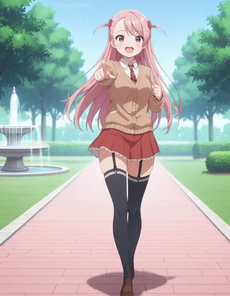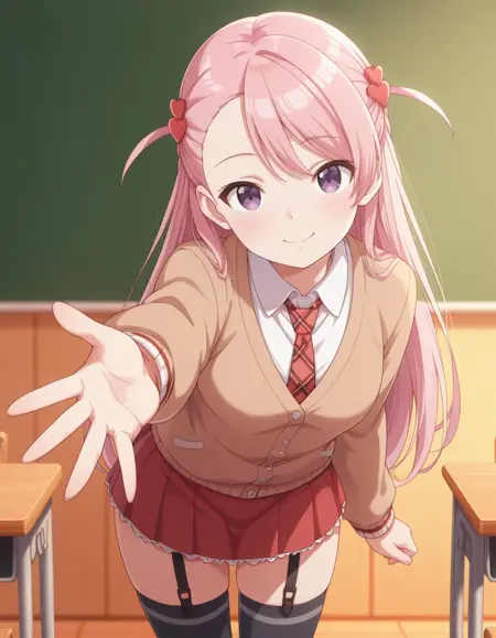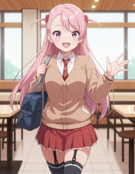 school uniform, brown cardigan, white collared shirt, plaid necktie, long sleeves, red pleated skirt, (garter straps:0.7), thighhighs, brown loafers