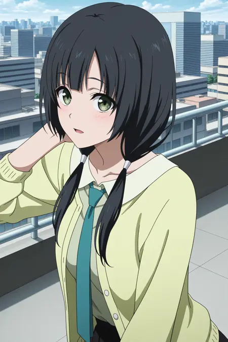 yasuhara ema, 长发, 黑发, 低双马尾, 发圈, 稀疏刘海, 绿眼, 长袖, 绿色开衫, 开襟开衫, 绿色衬衫, 水蓝色领带, 黑色裙子, 百褶裙, 黑色袜子, 过膝袜, 黄色鞋履, 靴子