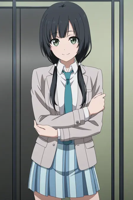 yasuhara ema, 长发, 黑发, 低双马尾, 发圈, 稀疏刘海, 绿眼, 长袖, 灰色夹克, 白色衬衫, 有领衬衫, 水蓝色领带, 蓝色裙子, 百褶裙, 竖条纹裙子, 蓝色袜子, 过膝袜, 黑色鞋履, 靴子