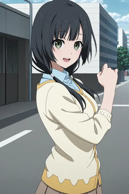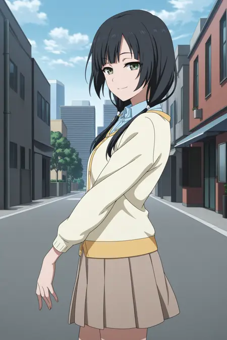 yasuhara ema, 长发, 黑发, 低双马尾, 发圈, 稀疏刘海, 绿眼, 长袖, 黄色开衫, 蓝色衬衫, 有领衬衫, 棕色裙子, 百褶裙, 蓝色袜子, 过膝袜, 棕色鞋履, 靴子