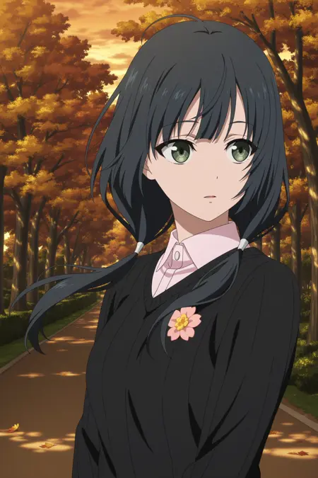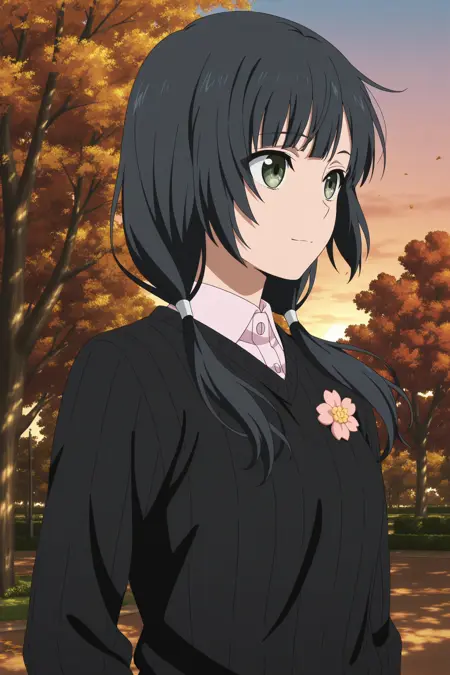 yasuhara ema, 长发, 黑发, 低双马尾, 发圈, 稀疏刘海, 绿眼, 七分袖, 黑色毛衣, 胸前有花饰, 粉色衬衫, 有领衬衫, 红色裙子, 纽扣裙, 棕色袜子, 过膝袜, 黑色鞋履, 靴子