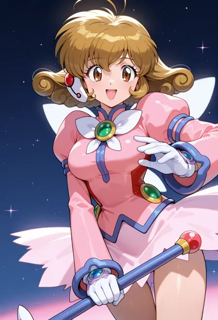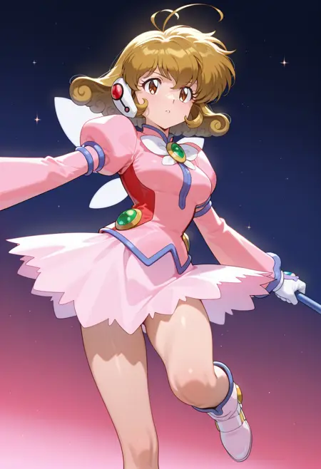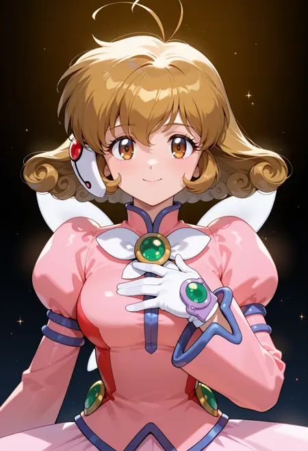 magical girl, single headset, pink dress, long sleeves, puffy sleeves, brooch, wings, white gloves, pink miniskirt, boots