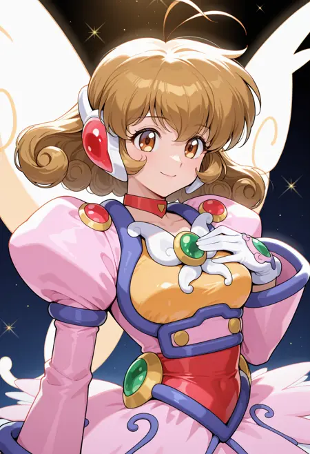 마법의 소녀, 모자, 드레스, 풍성한 짧은 소매, 브로치, 천사 날개, 배꼽, 흰 장갑, 미니스커트, 십자 끈 신발, 날개 달린 신발