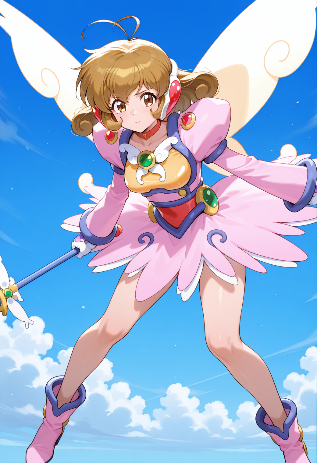 마법의 소녀, 단일 헤드셋, 분홍색 드레스, 긴 소매, 풍성한 소매, 브로치, 날개, 흰 장갑, 분홍색 미니스커트, 부츠