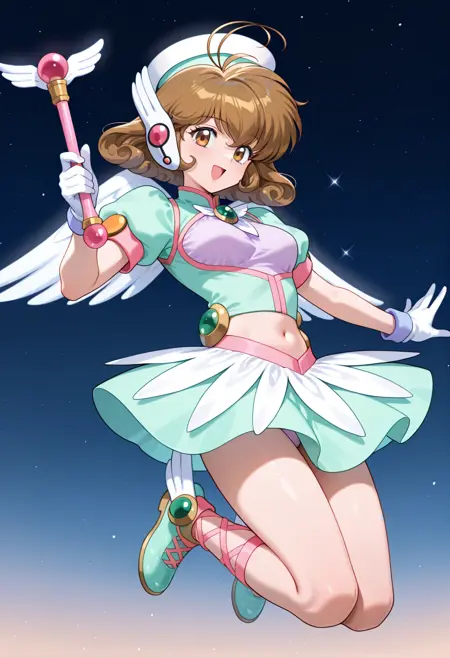 マジカルガール, 帽子, ドレス, パフ付き短袖, ブローチ, エンジェルの翼, へそ, 白い手袋, ミニスカート, 交差リボン式靴, 翼付きの靴