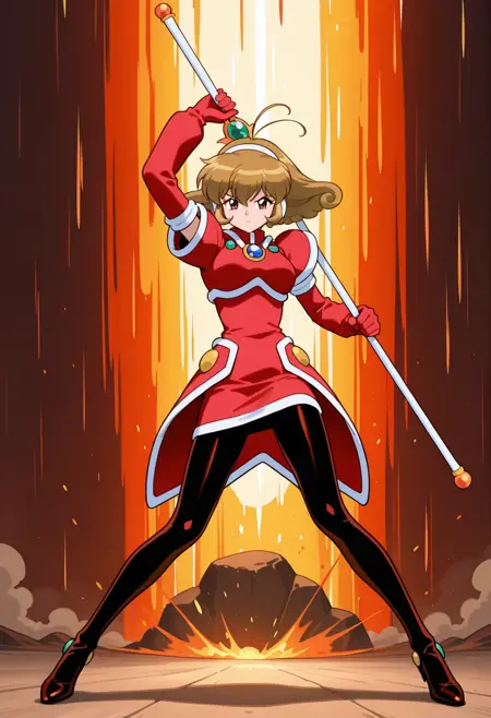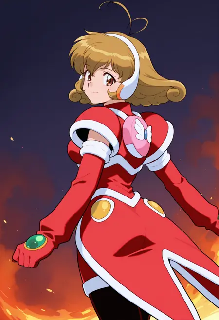 魔法少女, 发带, 红色护甲, 红色连衣裙, 胸针, 红色肘套, 铅笔裙, 连裤袜
