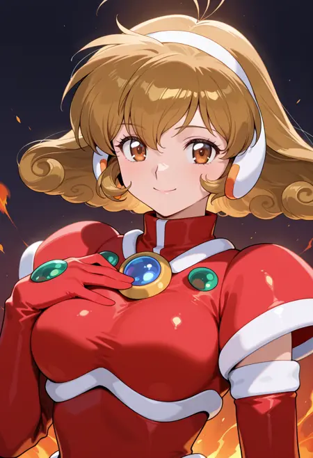 corrector_yui, fire_element_suit, 棕色头发, 短发, 天线发, 卷发, 胸部,