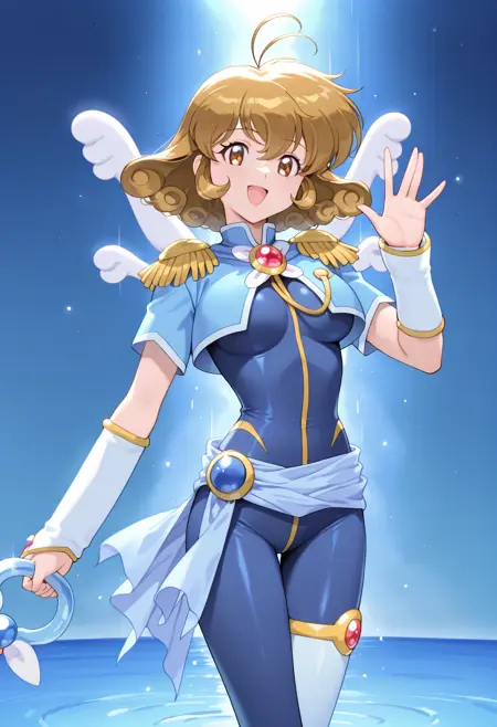 corrector_yui, angel_element_suit, brown hair, short hair, antenna hair, curly hair, breasts,