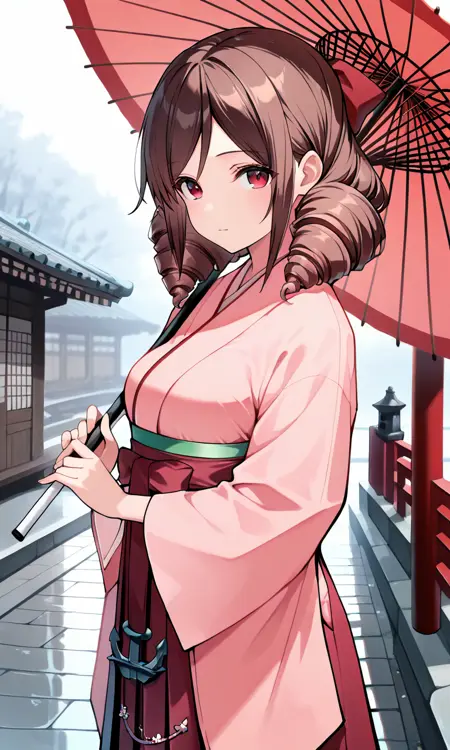 默认服装: harukazeKC, 长发, 棕发, 红眼, 长袖, 发带, 宽袖, 红色蝴蝶结, 钻石发型, 裲裆裙, 双钻发型, 红色裲裆, 粉色和服, 明治女学生制服, 锚饰,