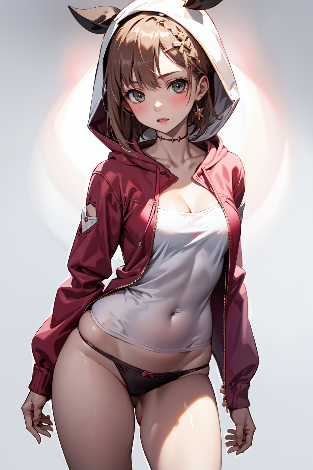주요 옷차림을 위해 다음 태그들이 도움이 될 수 있습니다: 빨간 반바지, 흰 셔츠, 민소매, (한 손 장갑), 머리 장식, 민소매 재킷, 허리, 허벅지 스타킹, 부츠 안의 허벅지 스타킹, 가죽 벨트, 관자놀이, 별 모양 목걸이