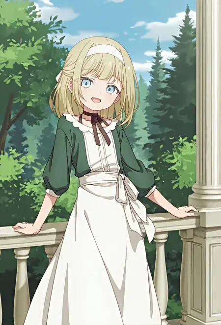 ros-default,blue eyes,blonde hair,medium hair,white hairband,ribbon choker,half updo,outdoors,green shirt,white apron,long skirt,brown footwear,