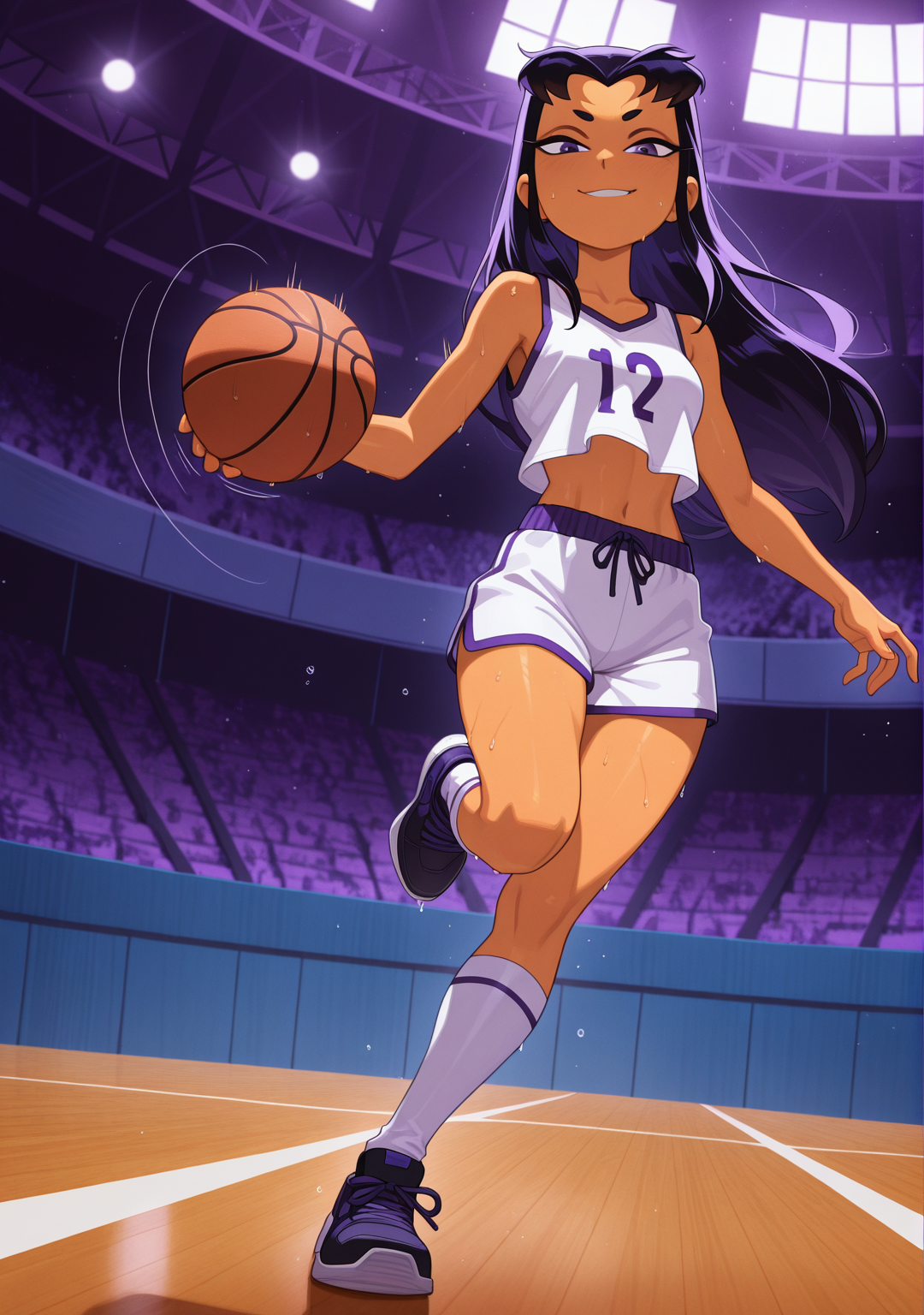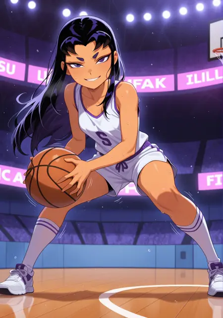 ベースプロンプト: "illublackfire, orange skin, long hair, black hair, purple eyes, "