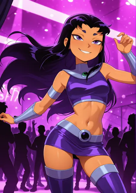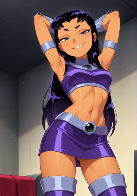 スターファイアの服装: クロップトップ、太ももブーツ、ミニスカート、ミドルリフ、ブレーサー