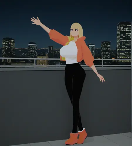 옷: 주황색 재킷, 흰색 셔츠, 검은 바지, 주황색 신발,