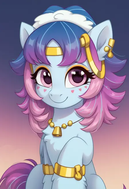 Clothing fluffy light blue leg warmers, golden bracelets on the front legs and a golden headband with a similar design on the ears, chest adorned with a golden necklace with a small bell-shaped pendant, white, fluffy headband