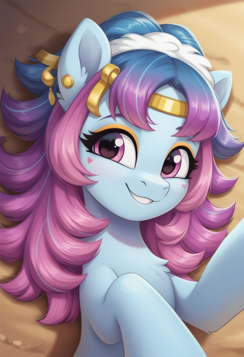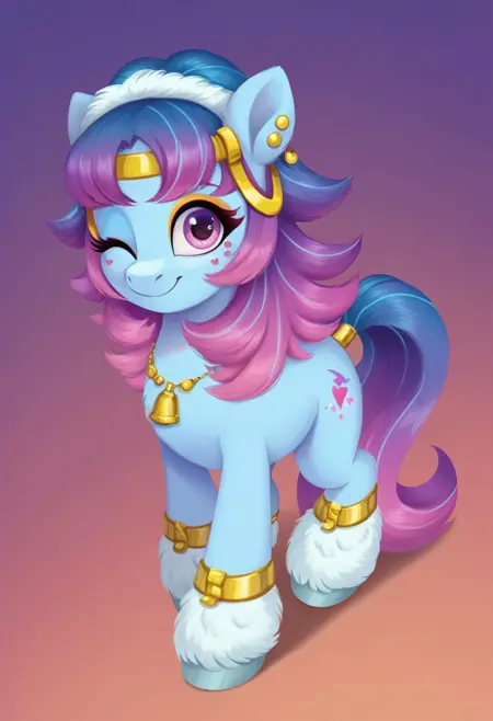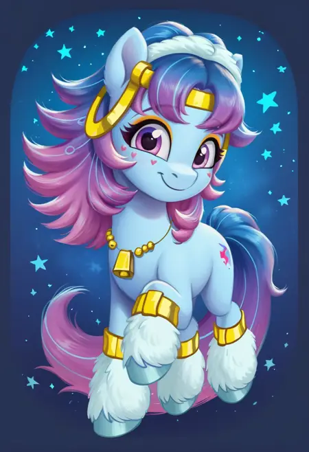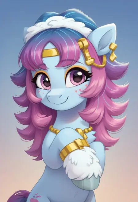 Clothing fluffy light blue leg warmers, golden bracelets on the front legs and a golden headband with a similar design on the ears, chest adorned with a golden necklace with a small bell-shaped pendant, white, fluffy headband