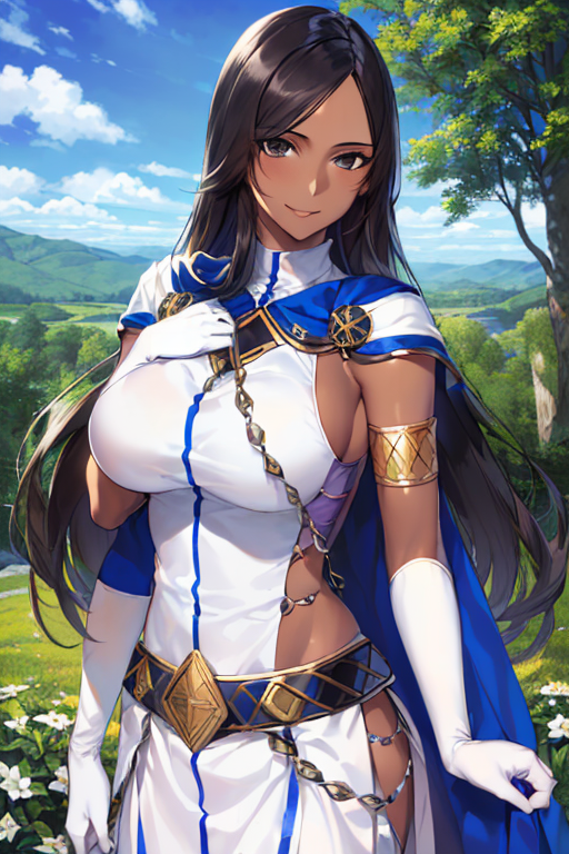 arjuna - third ascen (fate), white shirt, sleeveless, white elbow gloves, white pants, pelvic curtain, armlet, blue cape