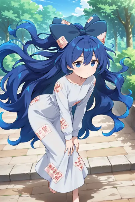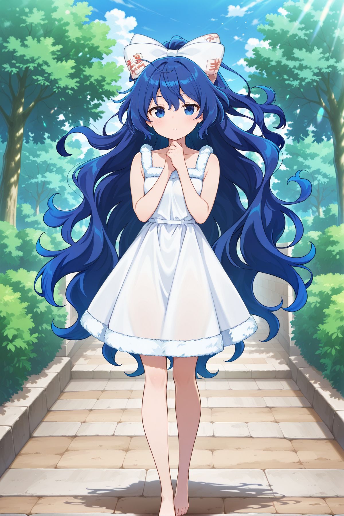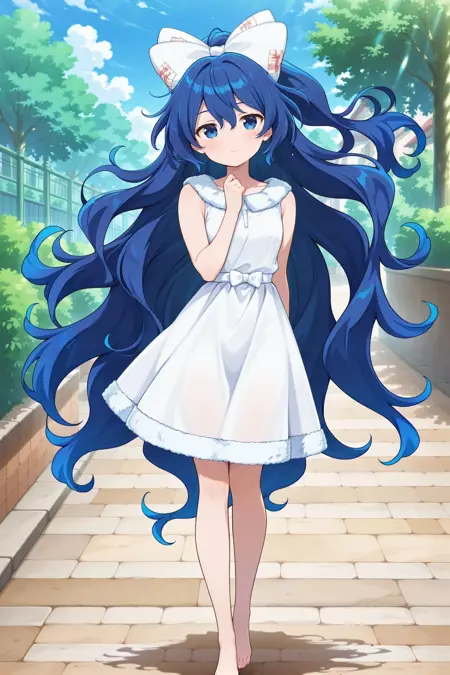 yorigami shion, 1girl, solo, blue eyes, blue hair, long hair, wavy hair, yorigami shion \(i wanna live here!\), alternate costume, hair bow, white bow, fur-trimmed bow, white dress, fur-trimmed dress, sleeveless dress, barefoot,
