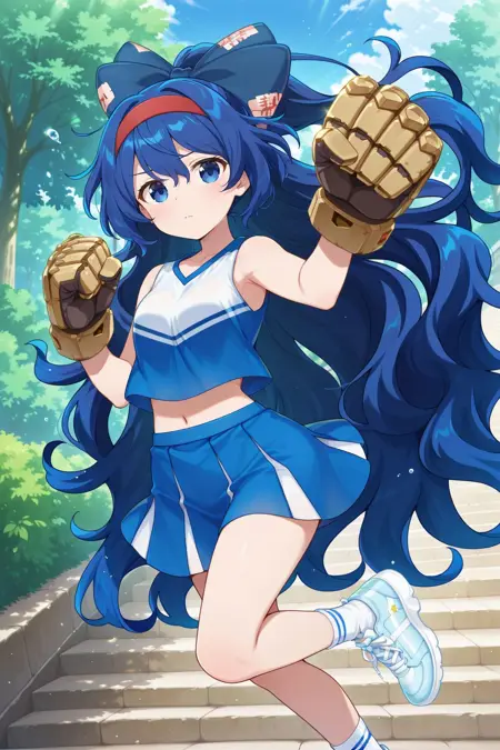 yorigami shion, 1girl, solo, blue eyes, blue hair, long hair, yorigami shion \(bill paid for with cheer\), alternate costume, blue shirt, blue skirt, cross-laced footwear, big gauntlets, armored gloves, hair bow, blue bow, red hairband, navel, cheerleader, socks, two-tone shirt, white shirt, white socks,