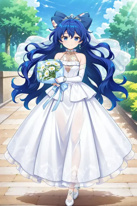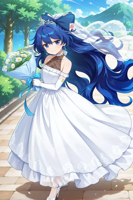 yorigami shion, 1girl, solo, blue eyes, blue hair, long hair, wavy hair, yorigami shion \(white roadside daisy\), alternate costume, silver tiara, hair bow, blue bow, bridal veil, teardrop earrings, white choker, wedding dress, white dress, sleeveless dress, see-through cleavage, elbow gloves, white gloves, fingerless gloves, white shoes, high heels, holding bouquet,