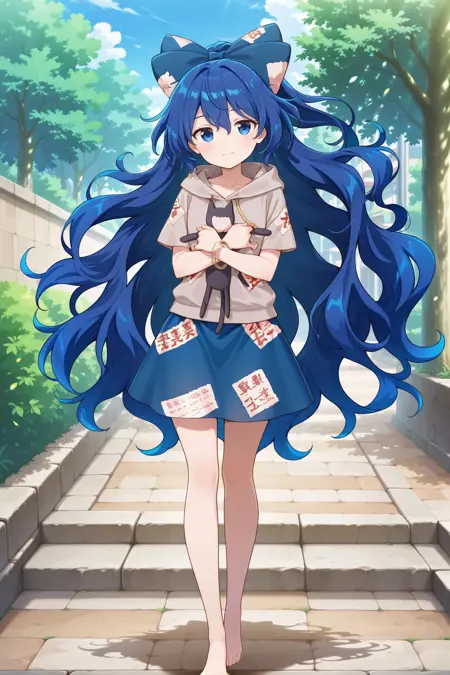 yorigami shion, 1girl, solo, blue eyes, blue hair, long hair,