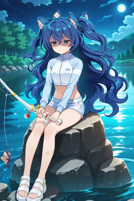 yorigami shion, 1girl, solo, blue eyes, blue hair, long hair, yorigami shion \(somewhat successful big sister\), alternate hairstyle, absurdly long hair, wavy hair, two side up, alternate costume, hair bow, blue bow, two-tone jacket, blue jacket, white jacket, long sleeves, blue shorts, cropped jacket, navel, bandaid on leg, white sandals, holding fishing rod,