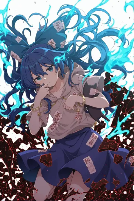 yorigami shion, 1girl, solo, blue eyes, blue hair, long hair,