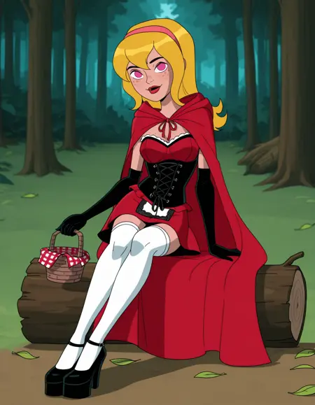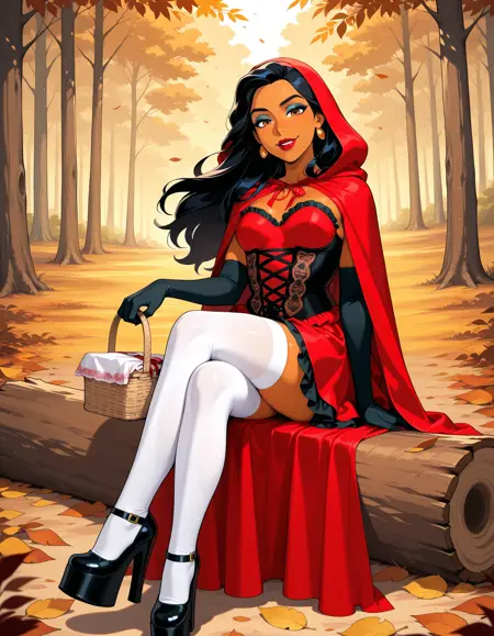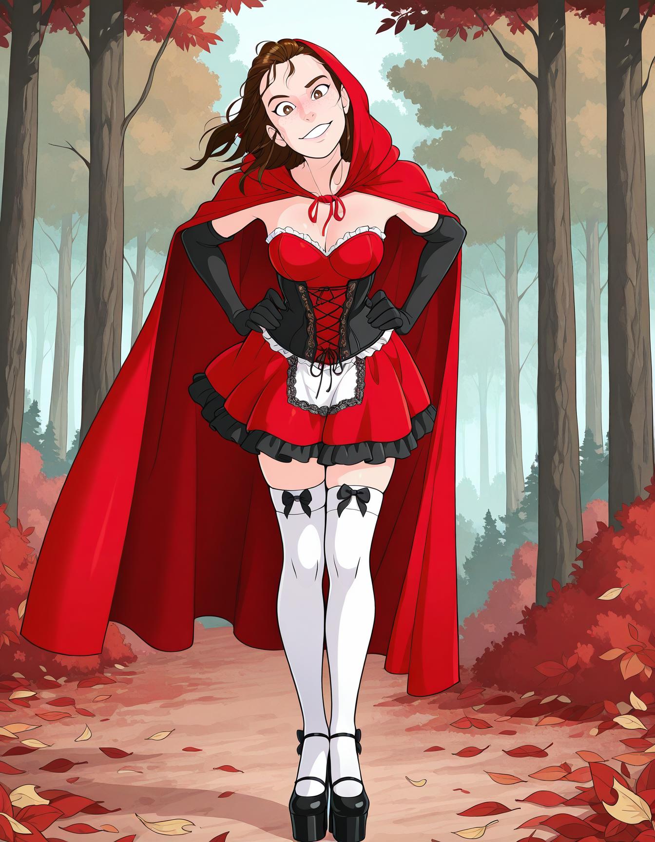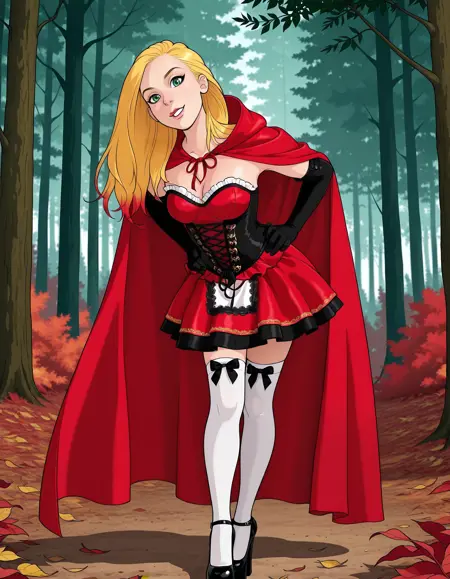 red dress, corset, hood, cape, elbow gloves, white thighhighs