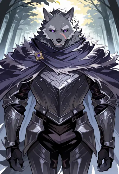 Anthro,wolf boy,blaidd,grey fur,black sclera,purple eyes,scar,fangs,tail,