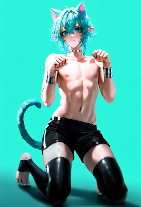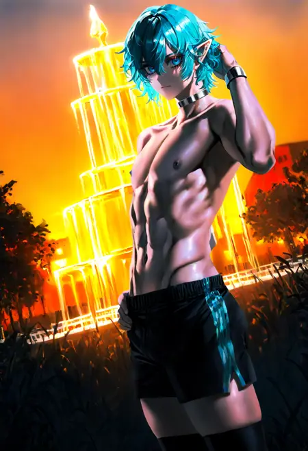 2. 맨발, 은색 목걸이, 배꼽, 유두, 반바지, 허벅지 긴 양말, 발가락이 없는 양말, 발톱, 상반신 노출된 남성, 은색 팔찌