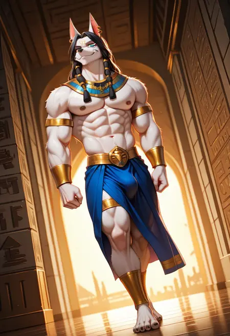 Areku Al-Khemi, anubian jackal, white fur, dreadlocks, braids, long hair, black hair, eye marking, earring, muscular male, bara, athletic build