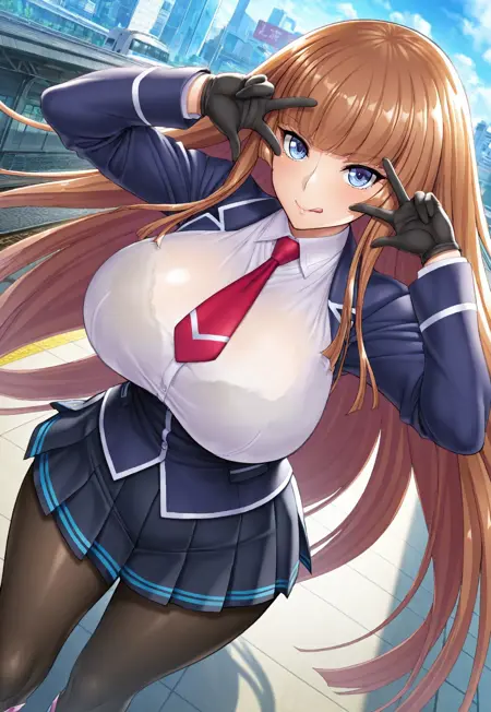 第二套服装:校服,蓝色西装外套,白色衬衫,乳头被遮盖,长袖,红色领带,百褶裙,丝袜,黑色手套