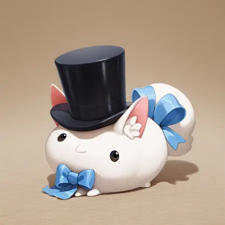 korsche, white fur, no mouth, feral, blue ribbon, tail, dot eyes, cherry tail ornament